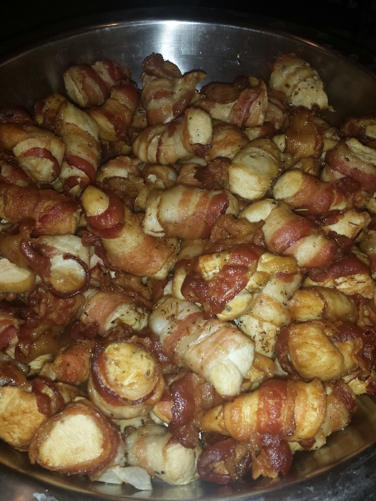 Fry in vegetable oil for 5 minutes so bacon get crispy than place the fried chicken bites in a baking pan and bake for 20 minutes .Check the chicken with a hot food thermometer to be at 165 F . Sprinkle with Italian spices. Done and ready to serve