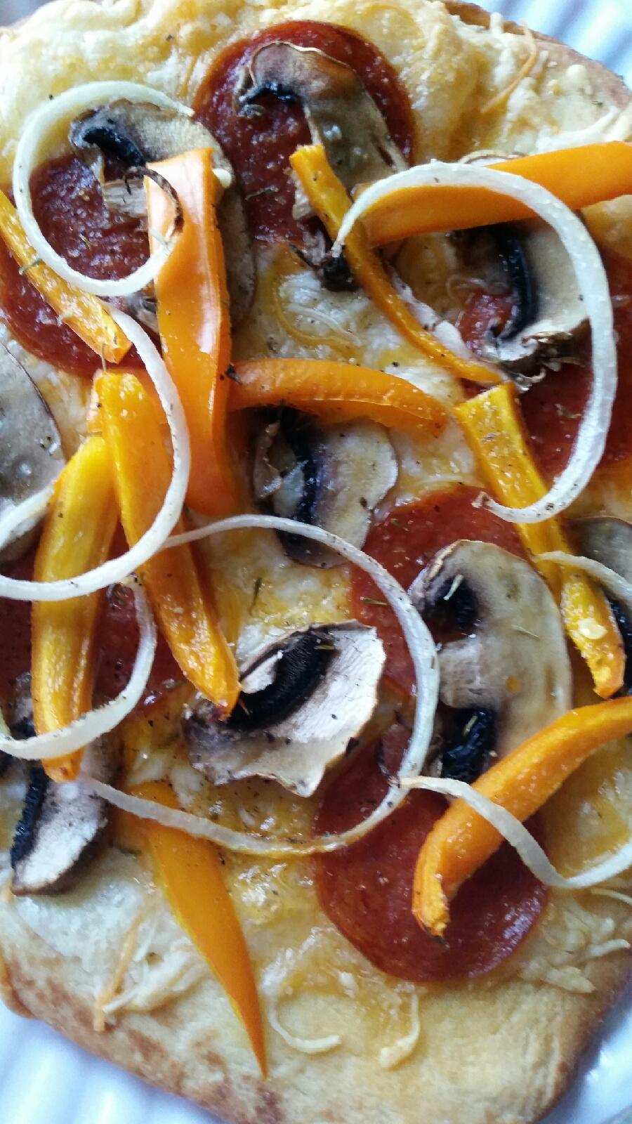 Naan bread or flat bread, Swiss cheese, pepperoni, sweet bell peppers, onion… possibilities are endless….bake for 5 minutes in a preheated oven at 400F.