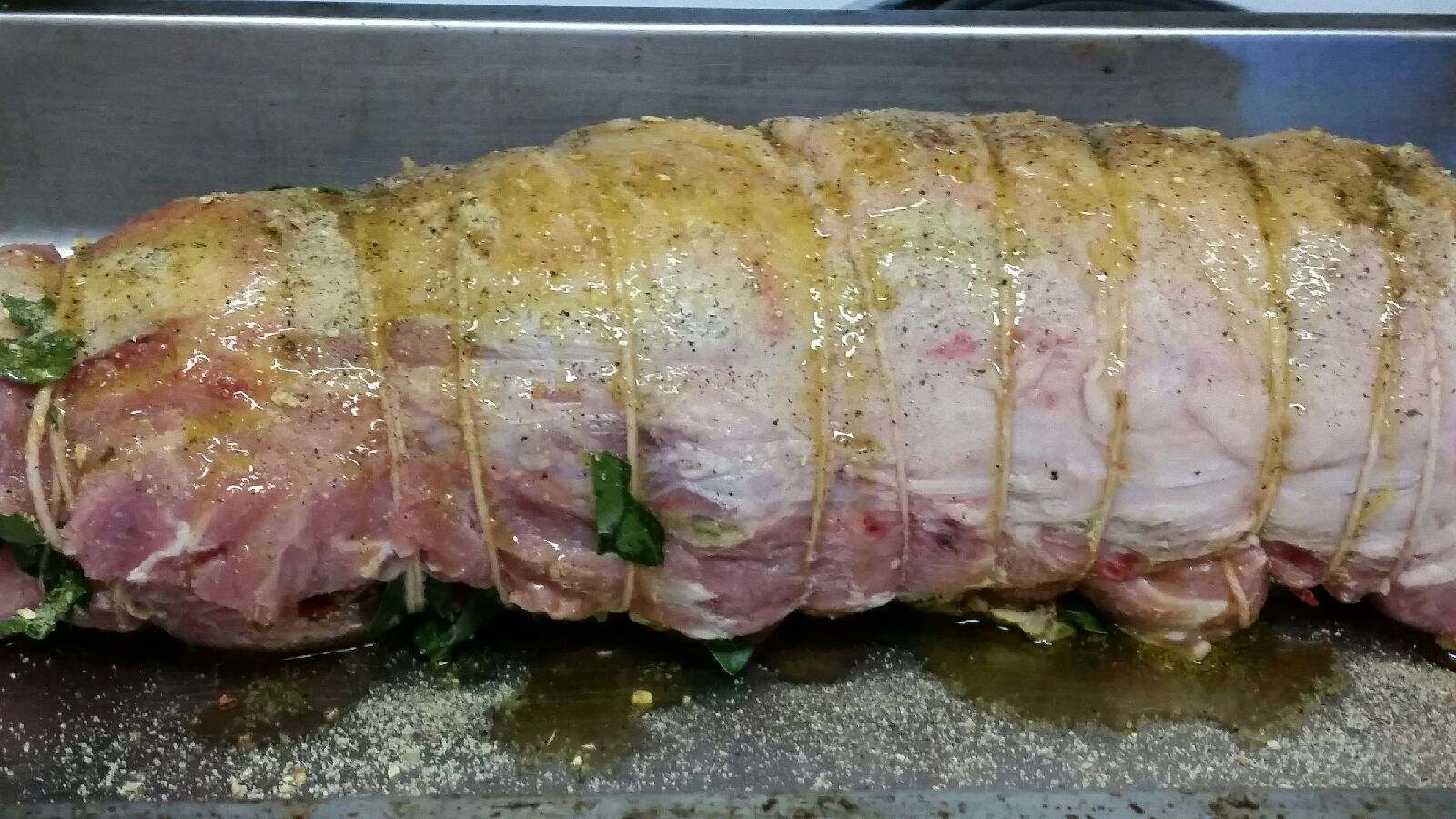 Roll the pork into a roulade and secure with butcher rope. Rub with olive oil, salt, pepper, garlic and cook in a preheated oven (Cook slow, no more than 300F) use a thermometer to check for 180F to make sure is fully cooked. All stuffed meats are cooked to 180F