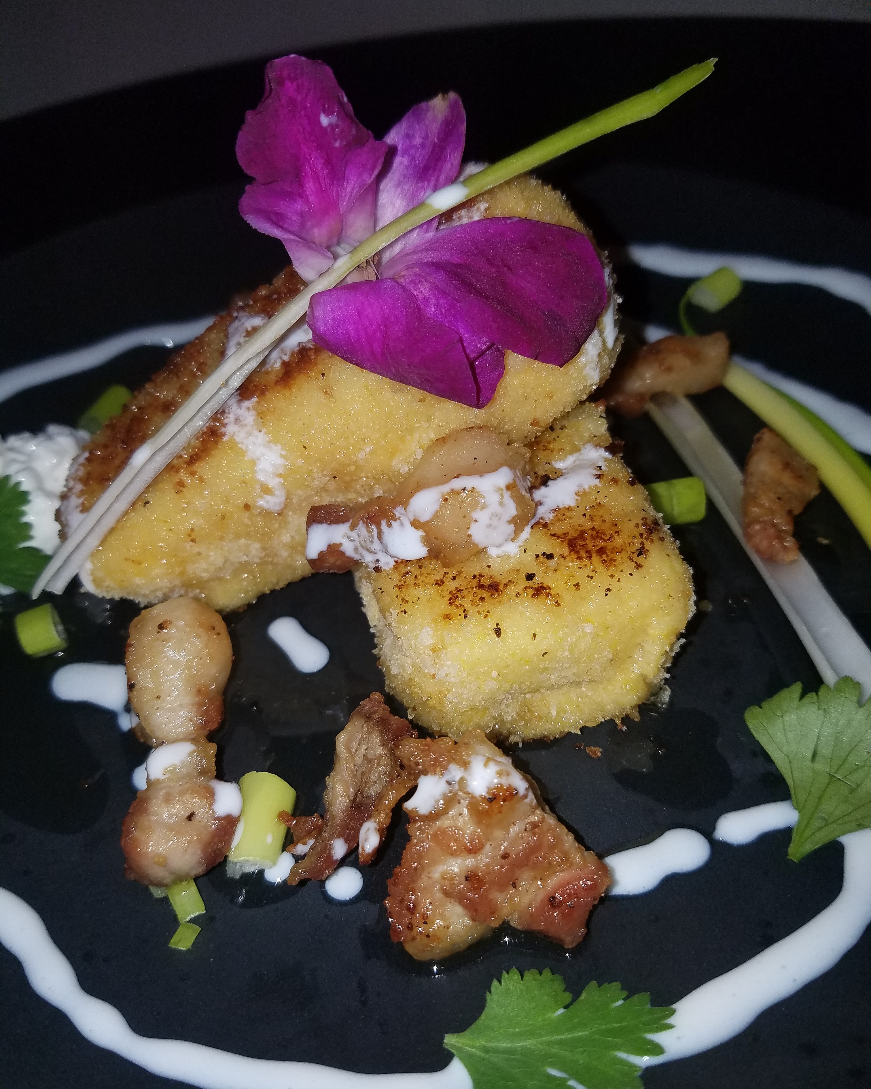 Stuffed polenta with cheese, onion pork belly, kefir and green onion