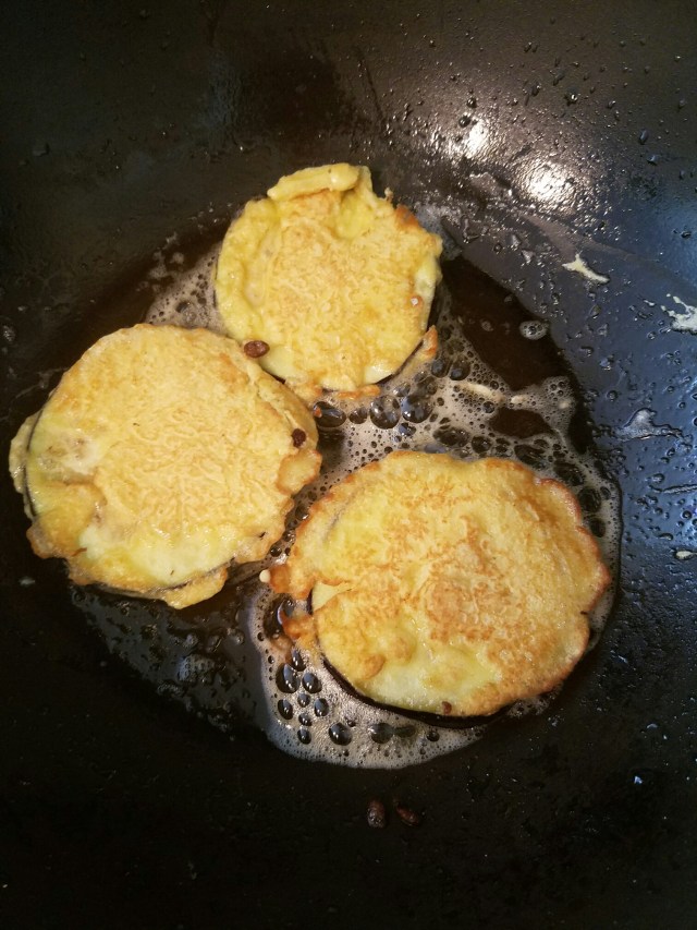 In a skillet, heat some olive oil and drop slices of eggplant dipped in batter you just made.