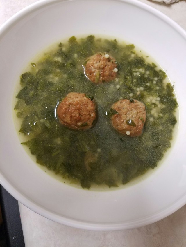 Simmer chicken stock add pasta and cook for 5 minutes. Add washed cleaned and treamed spinach then add cooked meat. Cook covered for another 5 minutes. Adjust with salt and pepper.